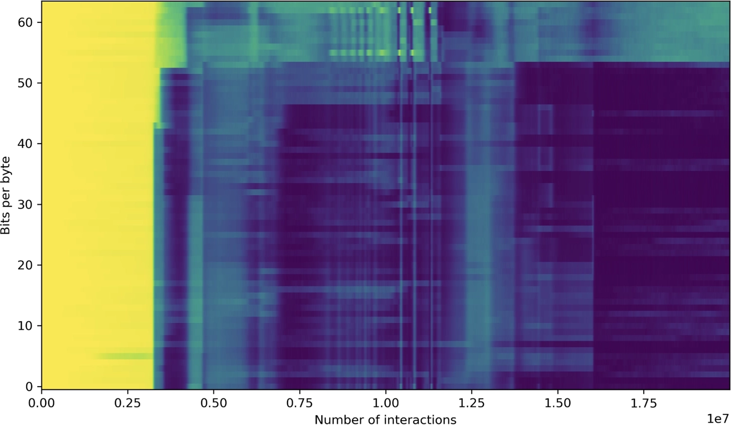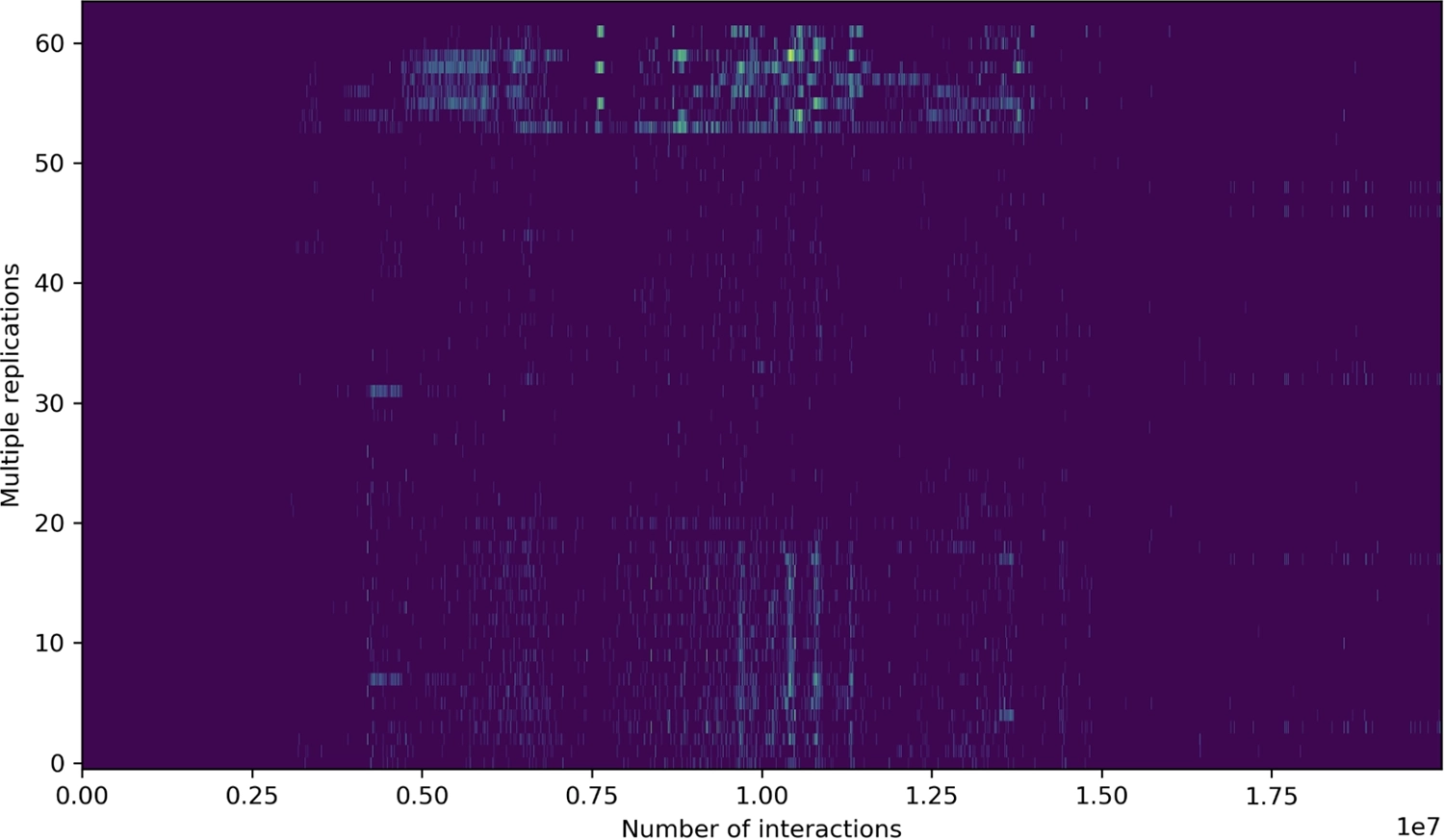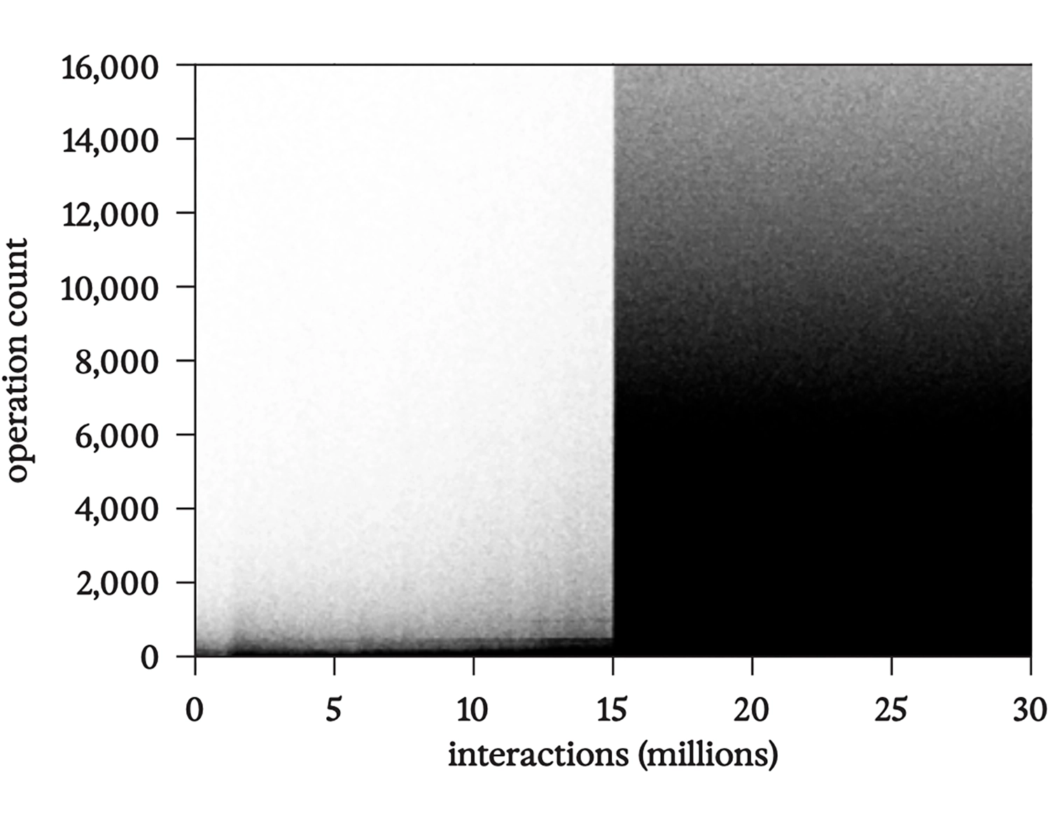 It couldn’t have happened much earlier. A serial computer requires serious processing power to loop through the automaton’s 6,329 cells over the sixty-three billion time steps required for the automaton to complete its reproductive cycle. Onscreen, it worked as advertised: a pixelated two-dimensional Rube Goldberg machine, squatting astride a 145,315 cell–long instruction tape trailing off to the right, pumping information out of the tape and reaching out with a “writing arm” to slowly print a working clone of itself just above and to the right of the original.