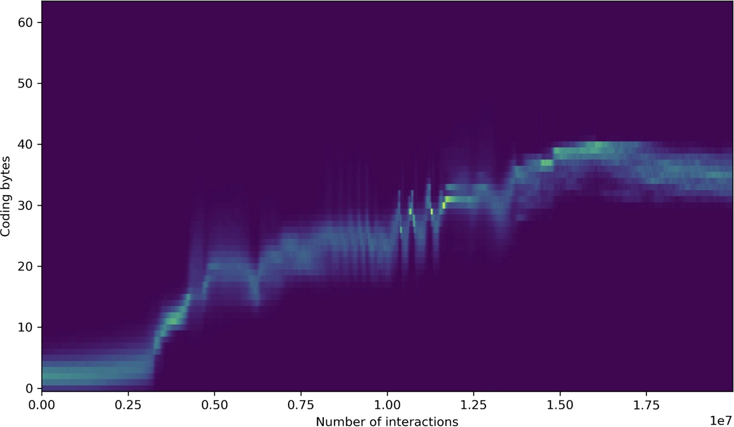 .” for “print” and “,” for “input.” Bff uses only “,” because instead of reading and writing to an external terminal or console, the tape reads and writes to itself. Thus copying a byte from one location to another requires only a single instruction. In our first paper describing bff, we included instructions “{” and “}” for moving the console pointer, but a stripped-down alternative, used here, simply initializes the data and console pointers with the first two bytes on the tape. ↩ -