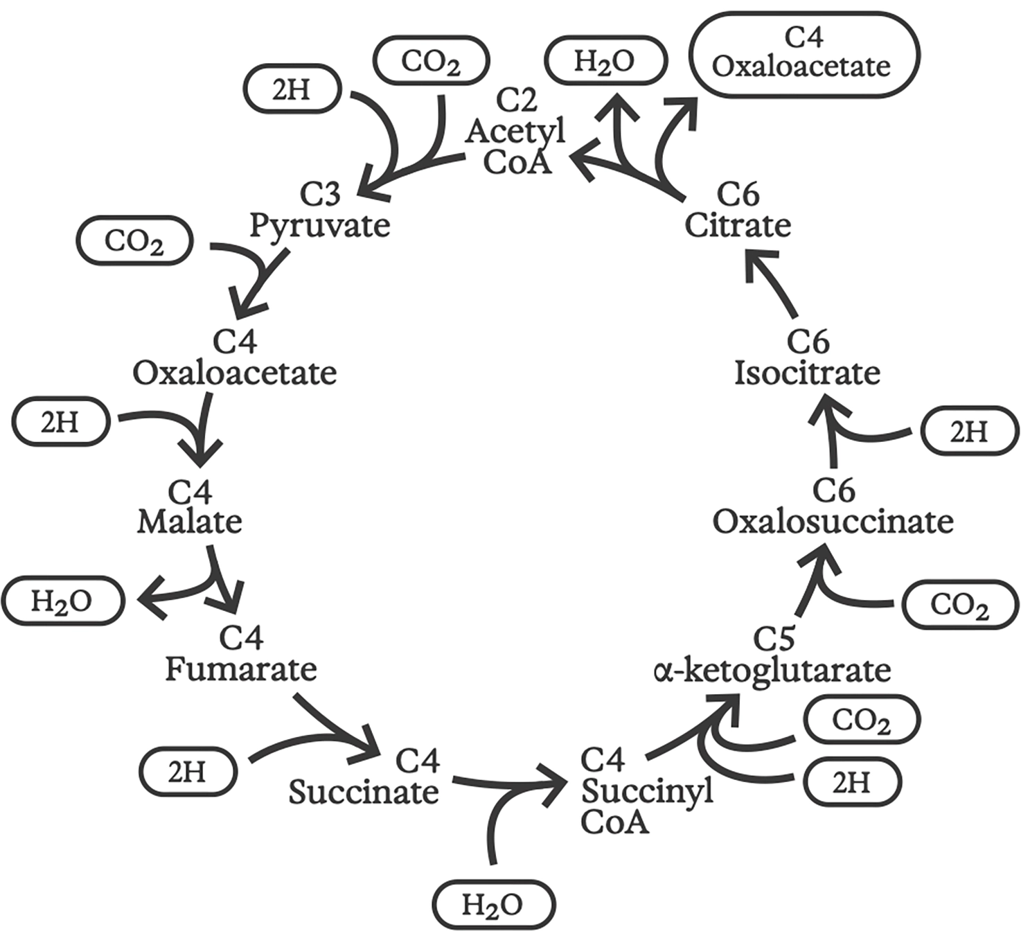 The ordinary or “forward” Krebs cycle was discovered in 1937 by groundbreaking biochemist Hans Krebs (1900–1981). More like a gas-powered generator than a motor, the Krebs cycle is at the heart of how all aerobic organisms on Earth “burn” organic fuels to release energy, a process known as “respiration.” 6 Inputs to this cycle of chemical reactions include complex organic molecules (which we eat) and oxygen (which we inhale); the “exhaust” contains carbon dioxide and water (which we exhale). The energy produced maintains proton gradients across folded-up membranes inside our mitochondria, and the flow of these protons goes on to power every other cellular function.