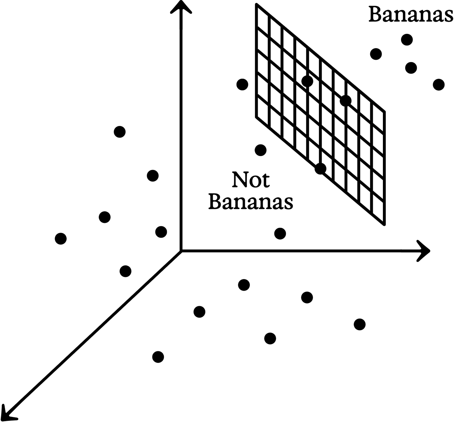 Conceptual sketch of a hyperplane separating points representing banana images from non-banana images