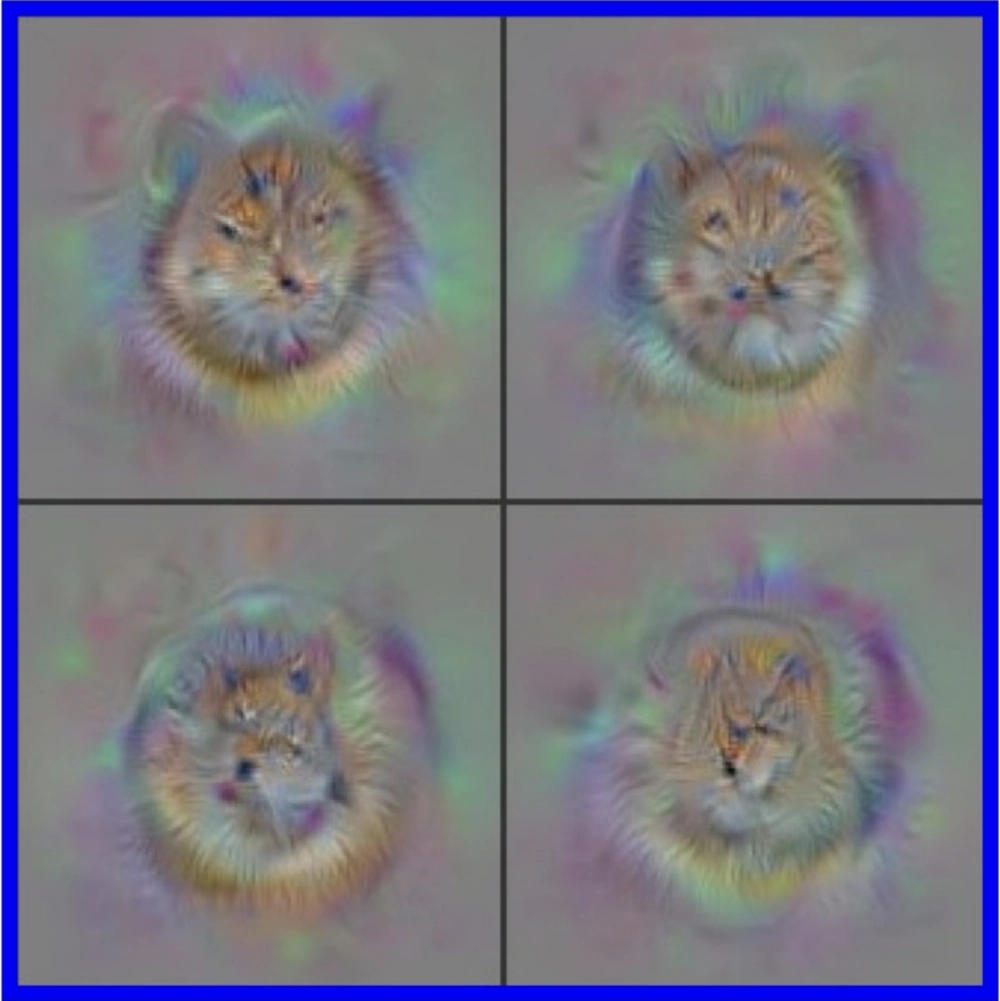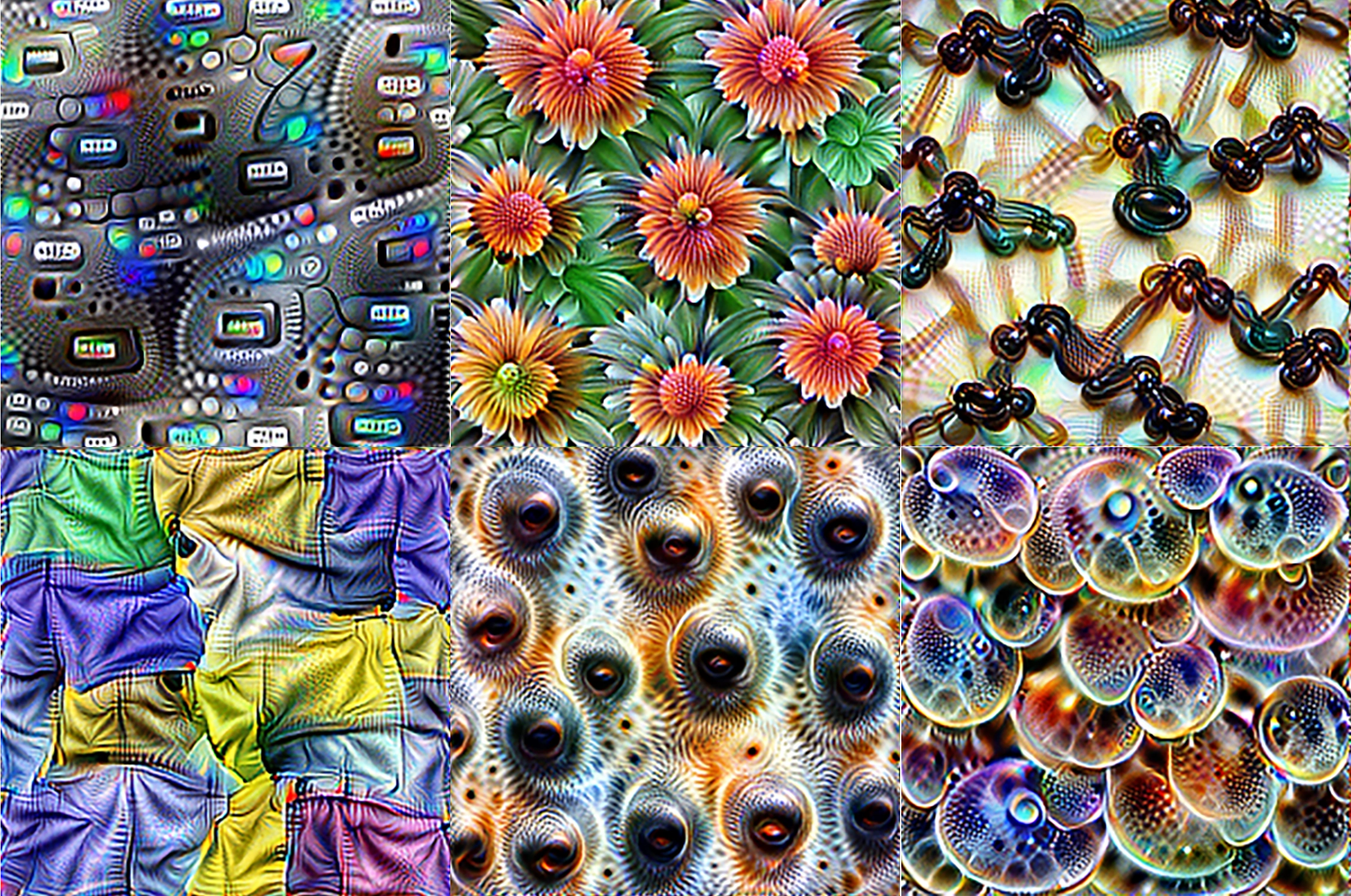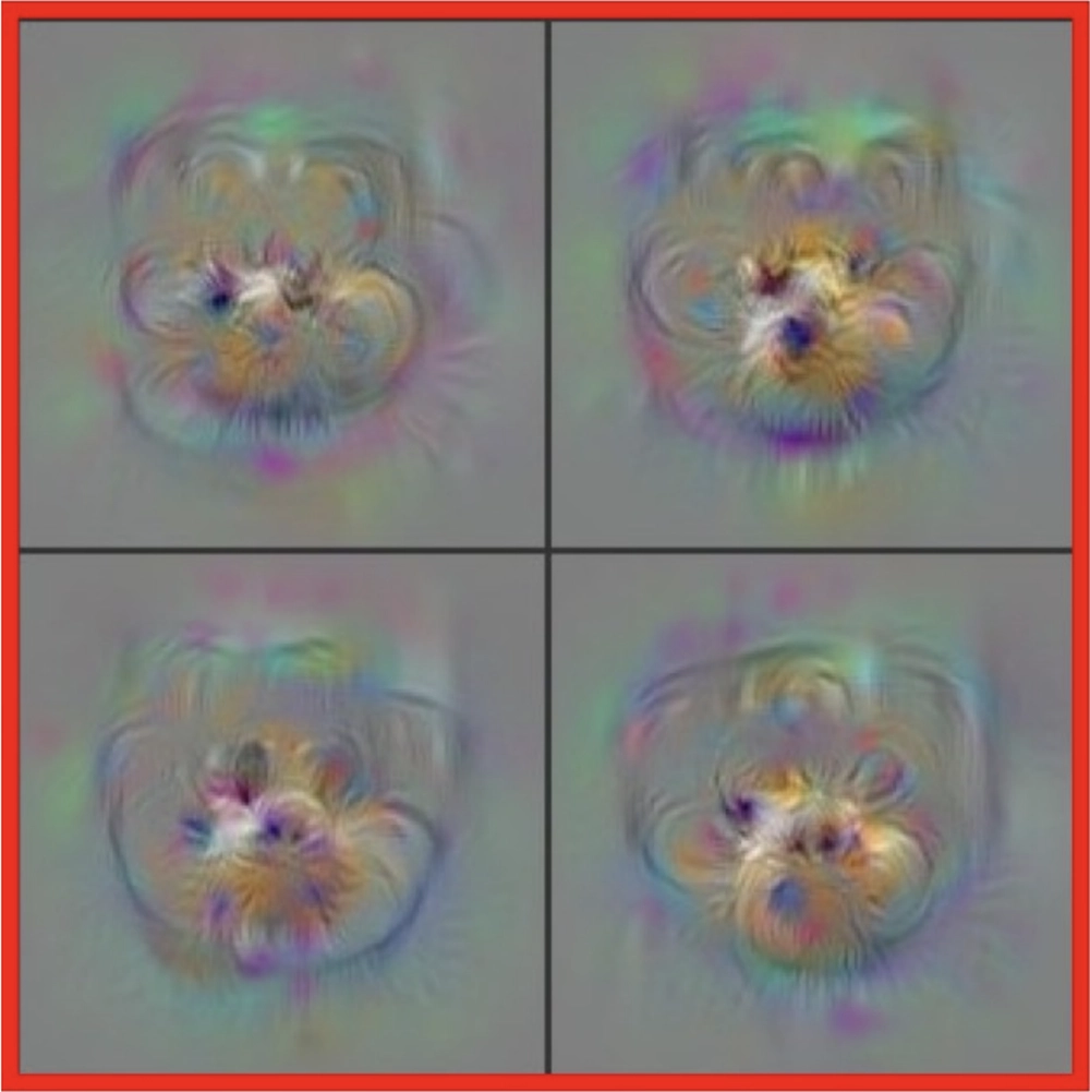 Images optimized to selectively activate specific neurons in different layers of a CNN. Neurons in early layers are sensitive to primitive features like edges, intermediate layers respond to textures and patterns, and later layers recognize semantically meaningful objects and object parts; from Olah, Mordvintsev, and Schubert 2017.