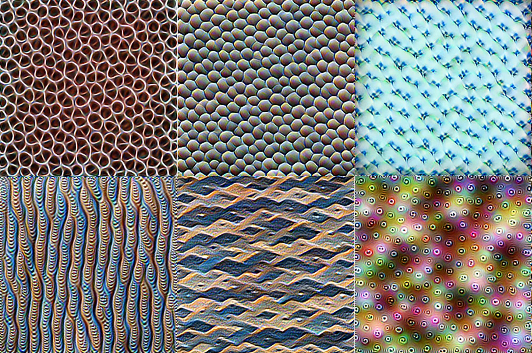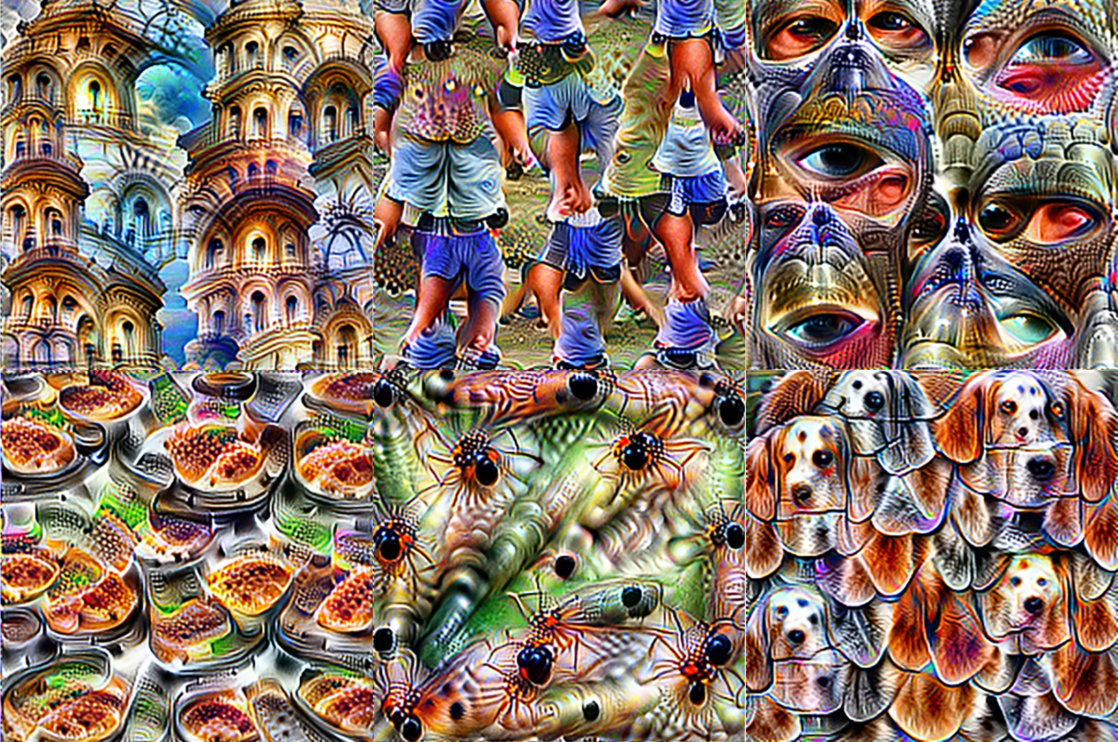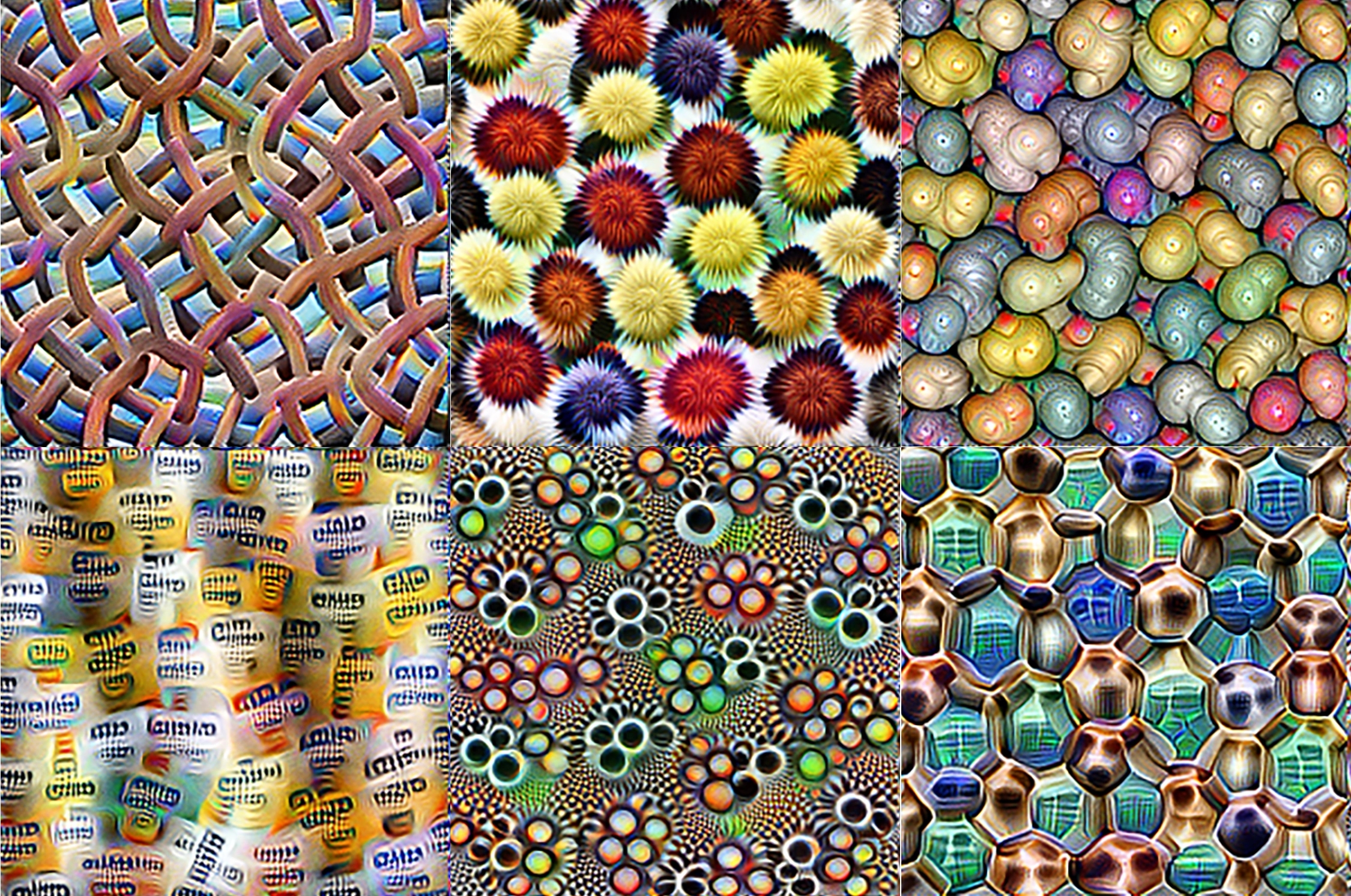Images optimized to selectively activate specific neurons in different layers of a CNN. Neurons in early layers are sensitive to primitive features like edges, intermediate layers respond to textures and patterns, and later layers recognize semantically meaningful objects and object parts; from Olah, Mordvintsev, and Schubert 2017.