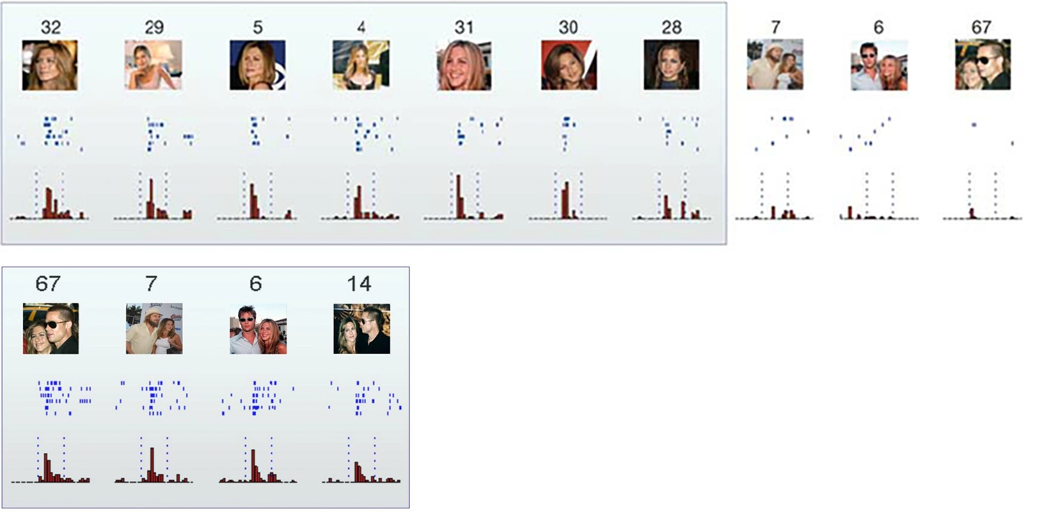 Responses of single neurons in the hippocampus to a selection of the eighty-seven pictures presented to a human patient. The first neuron fired to all pictures of Jennifer Aniston alone, but not (or only very weakly) to other famous and non-famous faces, landmarks, animals, or objects. Neither did the neuron respond to pictures of Jennifer Aniston together with Brad Pitt— though another neuron (bottom row) fired only in response to the pair; Quiroga et al. 2005.