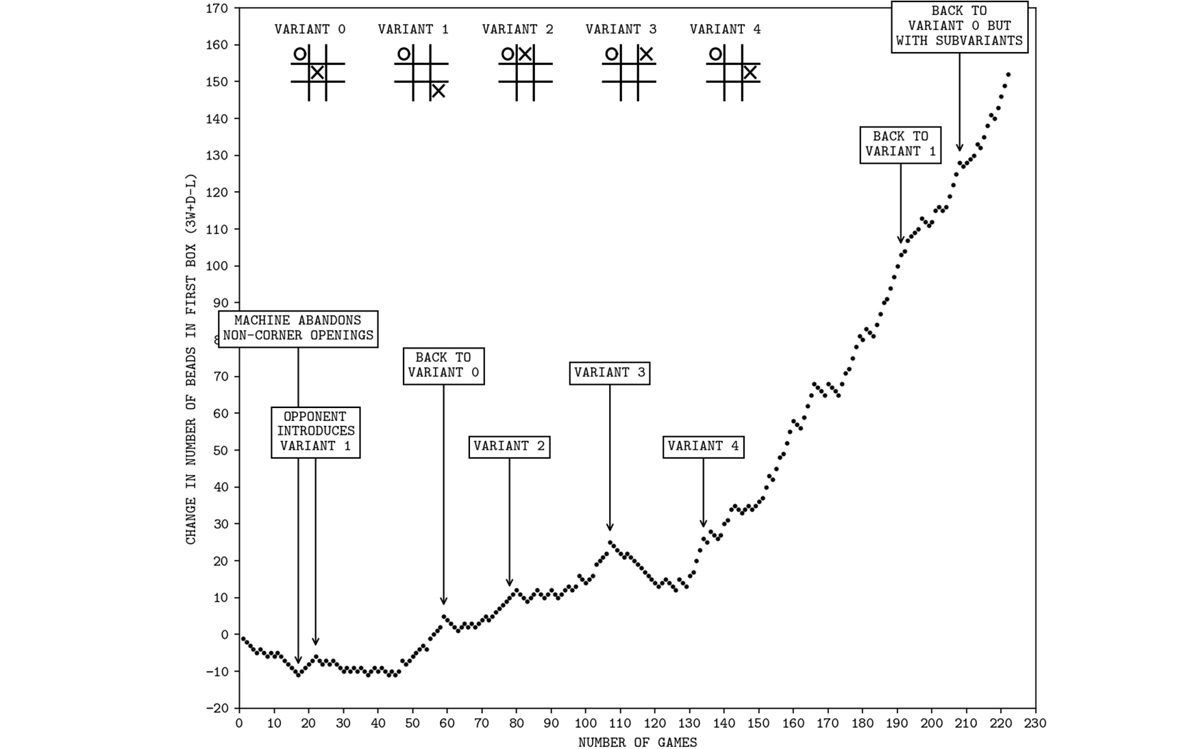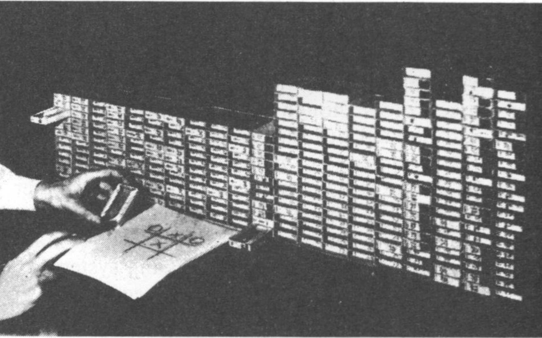 In 1961, AI researcher Donald Michie devised MENACE, the Matchbox Educable Noughts and Crosses Engine, an early reinforcement-learning algorithm for playing tic-tac-toe. Initially, lacking access to a computer, Michie implemented the algorithm using an array of 304 matchboxes representing unique board states, each containing beads representing the current best policy; Michie 1963.