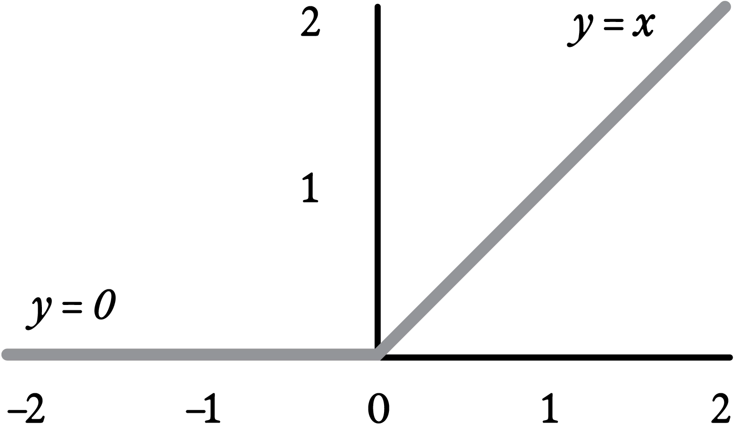 One of the most commonly used nonlinearities is ReLU, which stands for “Rectified Linear Unit”; such a neuron has zero response if the weighted sum of its inputs is less than zero, and otherwise has activation equal to that weighted sum. Like softmax (which, recall, approximates lateral inhibition in real neurons), ReLU is inspired by basic neuroscience. Real neurons either fire action potentials or don’t. Their firing rate is thus either zero or positive; a neuron can’t have a negative response. ReLU is pretty much the simplest nonlinear alteration one can make to the linear “identity function” f (x)= x to avoid negative output in an artificial neuron.