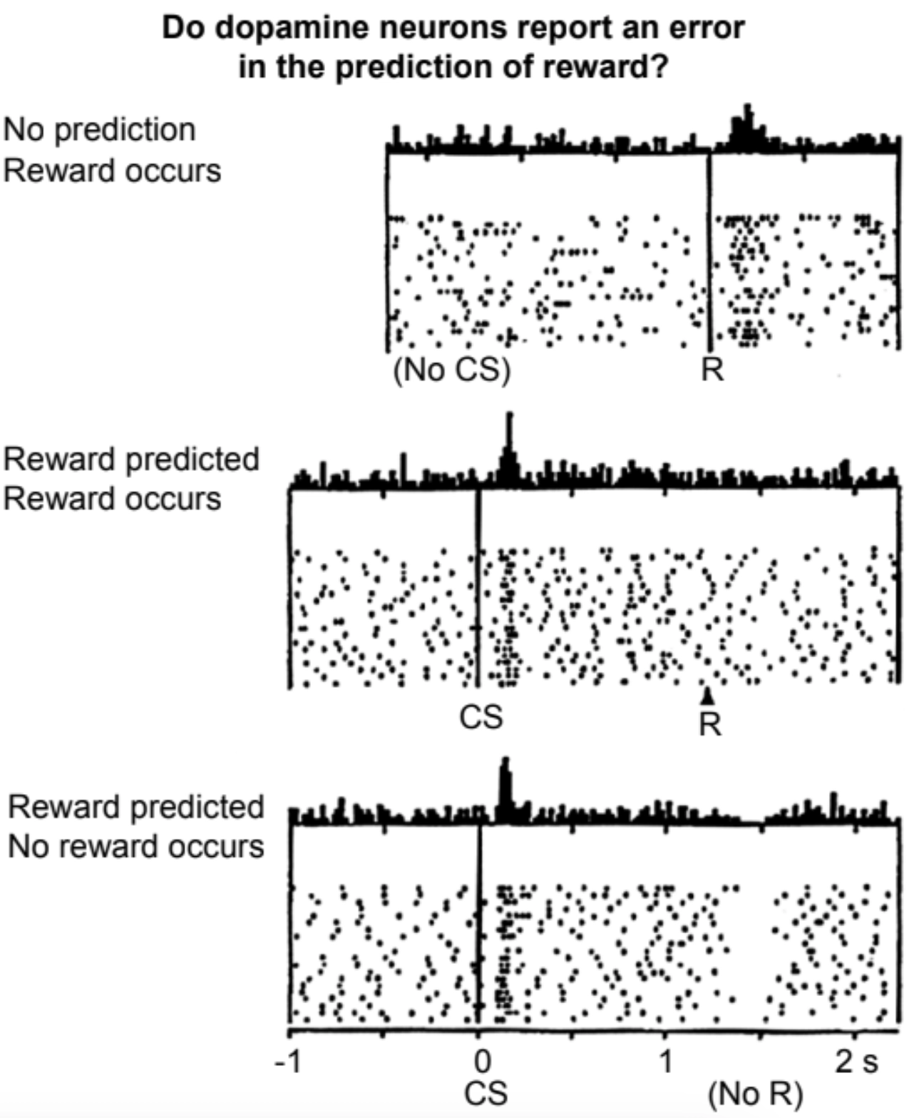 Recordings from a dopamine neuron when an unexpected reward is received, an expected reward is received, and an expected reward is not received; Schultz, Dayan, and Montague 1997.