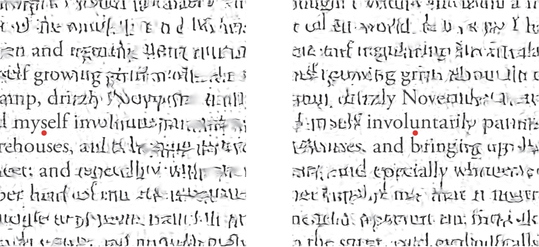 Under controlled experimental conditions— viewed at the appropriate distance through a single eye fixated on the dot in each— these synthetic images are visual “metamers,” meaning they are indistinguishable from an undistorted version of this page of text from Moby-Dick. This illustrates the relatively small area around the fovea where we can clearly resolve detail; from J. Freeman and Simoncelli 2011.