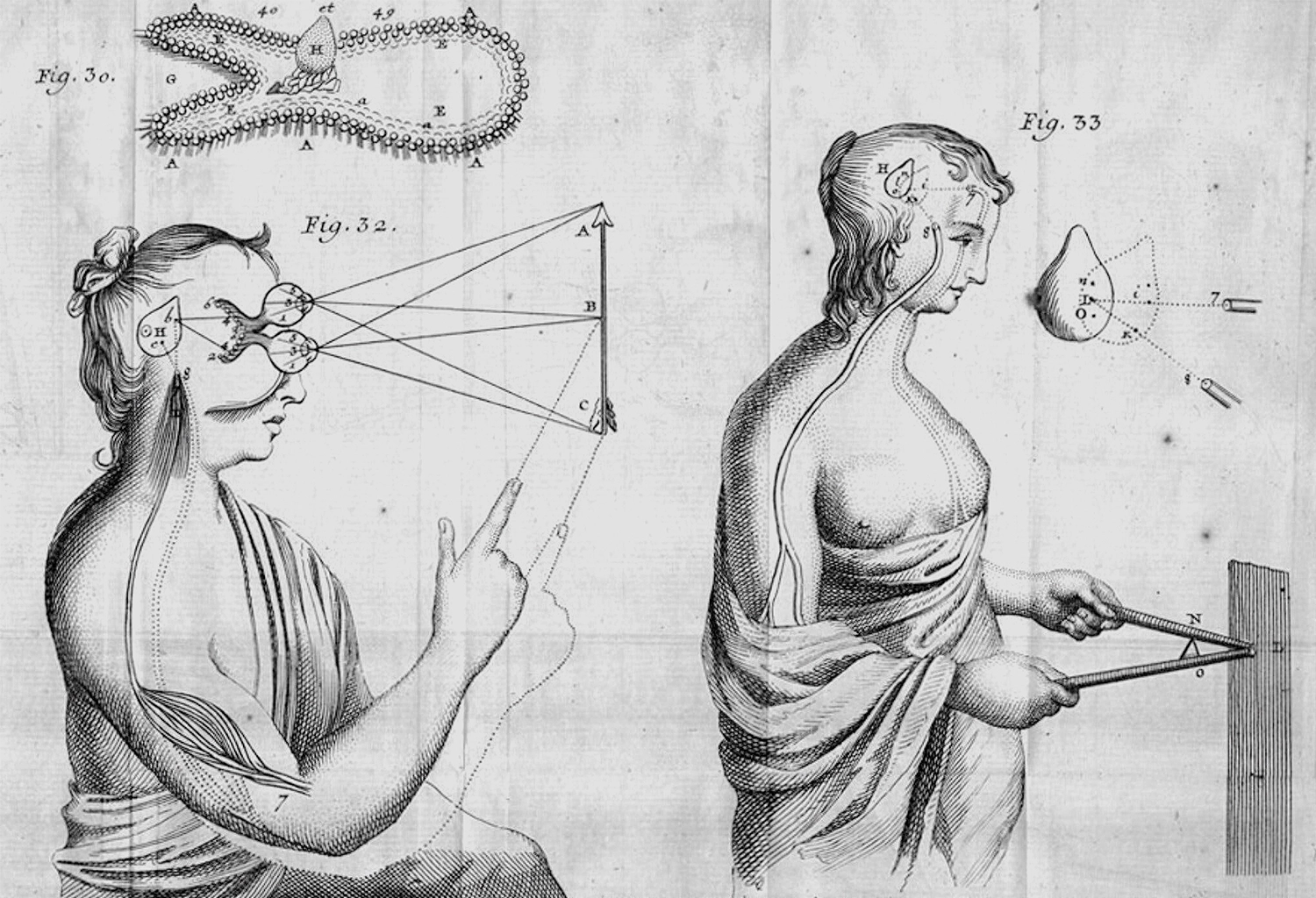 Illustrations of the pineal gland, seat of the soul, hydraulically “puppeteering” the body using psychic pneuma; Descartes 1677