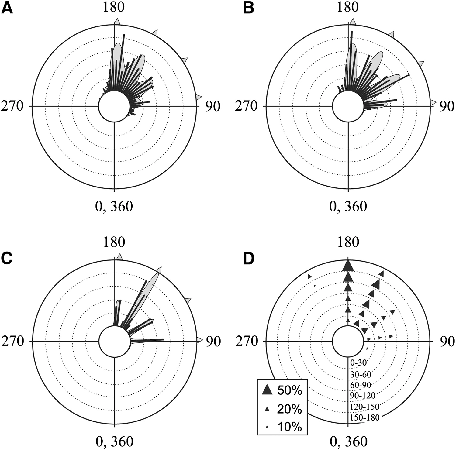 Polar plots of the escape trajectories of cockroaches startled by a gust of wind, showing random selection from among several preferred directions: (A) 431 pooled responses from five individuals; (B) frequency histograms of eighty-six individuals; (C) a histogram of the wind angles for the thirty-eight responses in (A) where the cockroach did not turn its body; and (D) a diagram illustrating the effect of wind direction on escape trajectory; for details, see Domenici et al. 2008.
