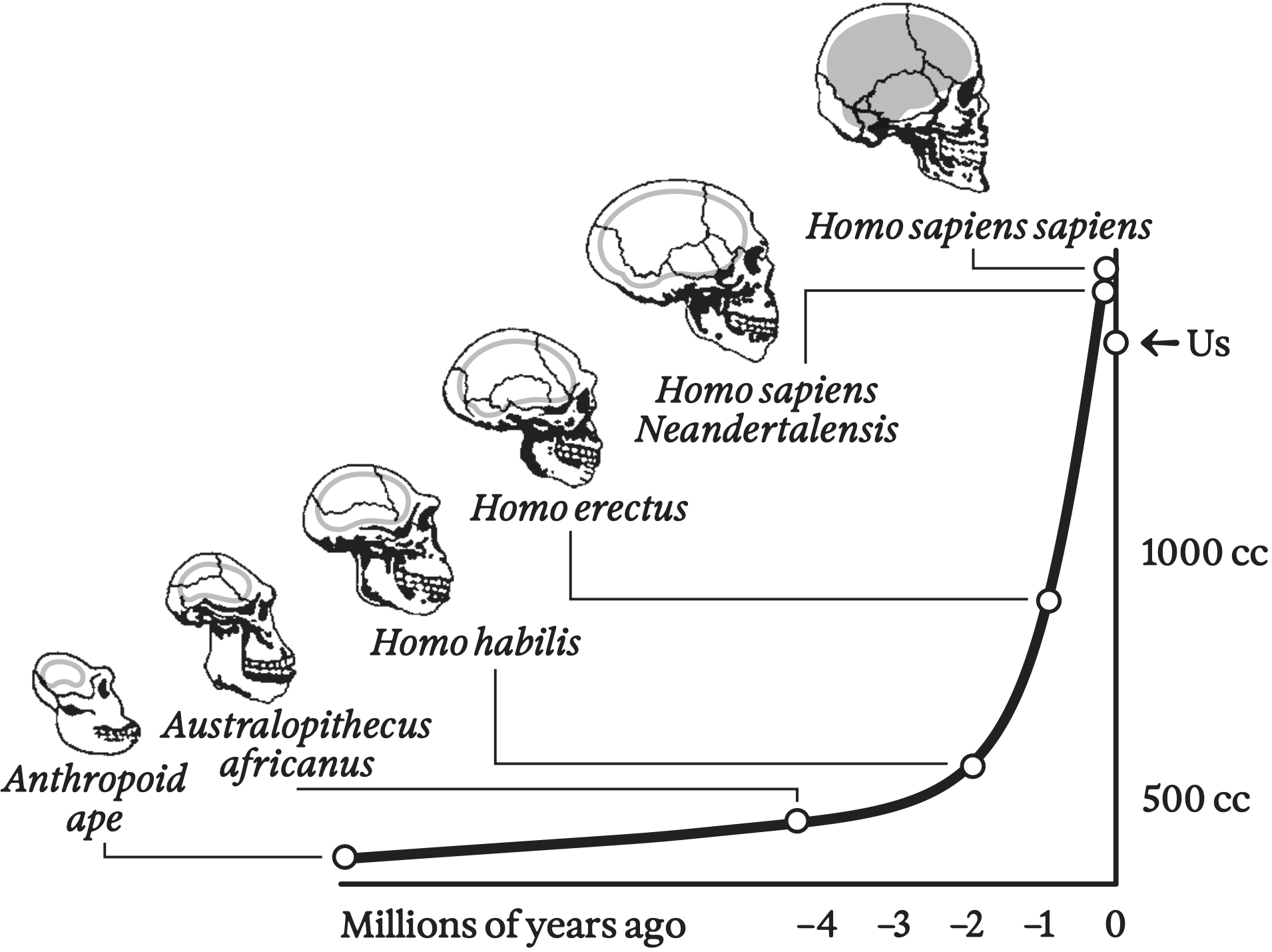 Explosion in hominin brain size over the past several million years (however, note the recent drop, possibly associated with the takeoff of social evolution and the division of labor)