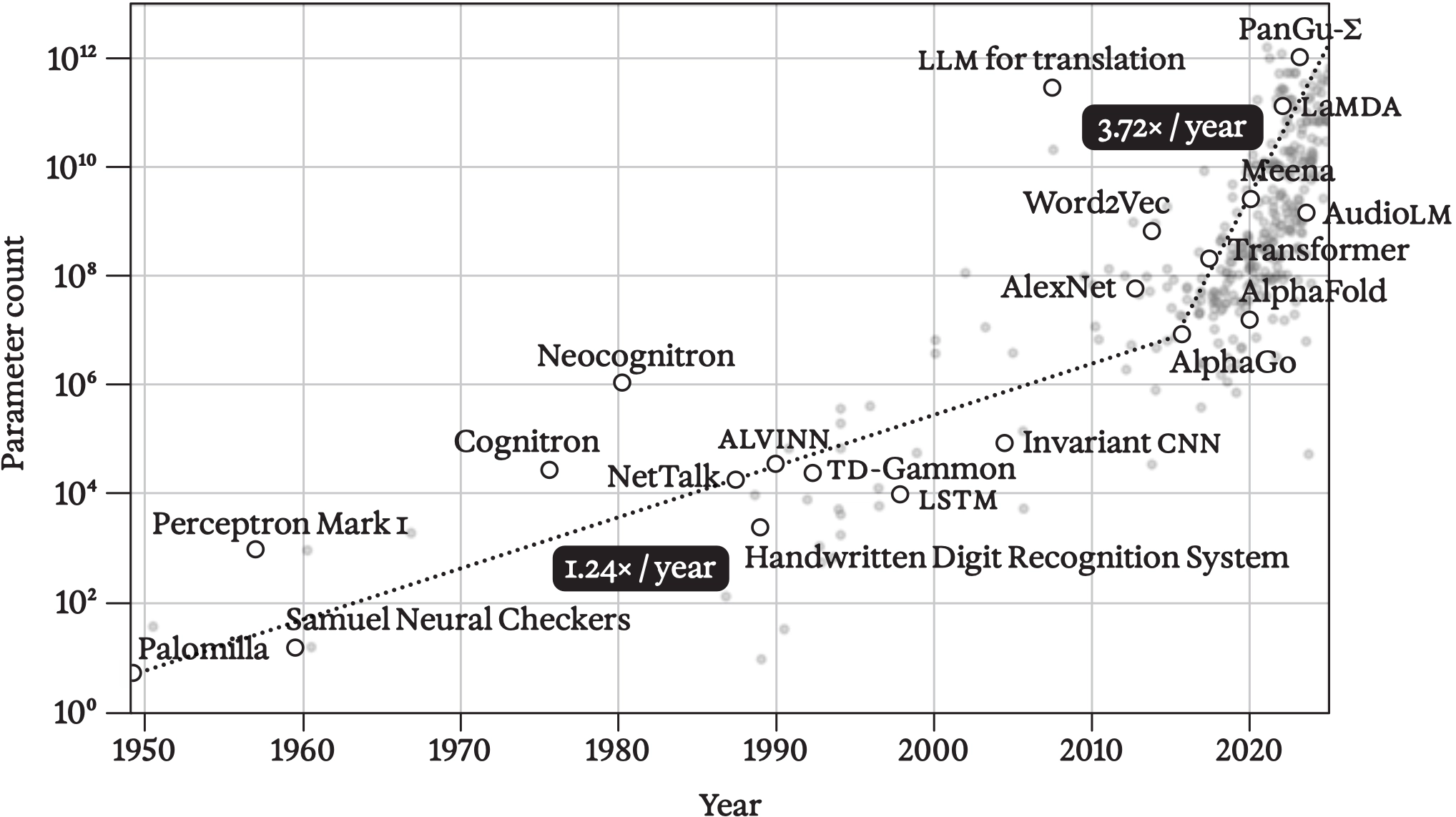 Exponential growth in model size, doubling approximately every 3.2 years from 1949 to 2015, and every six months since then