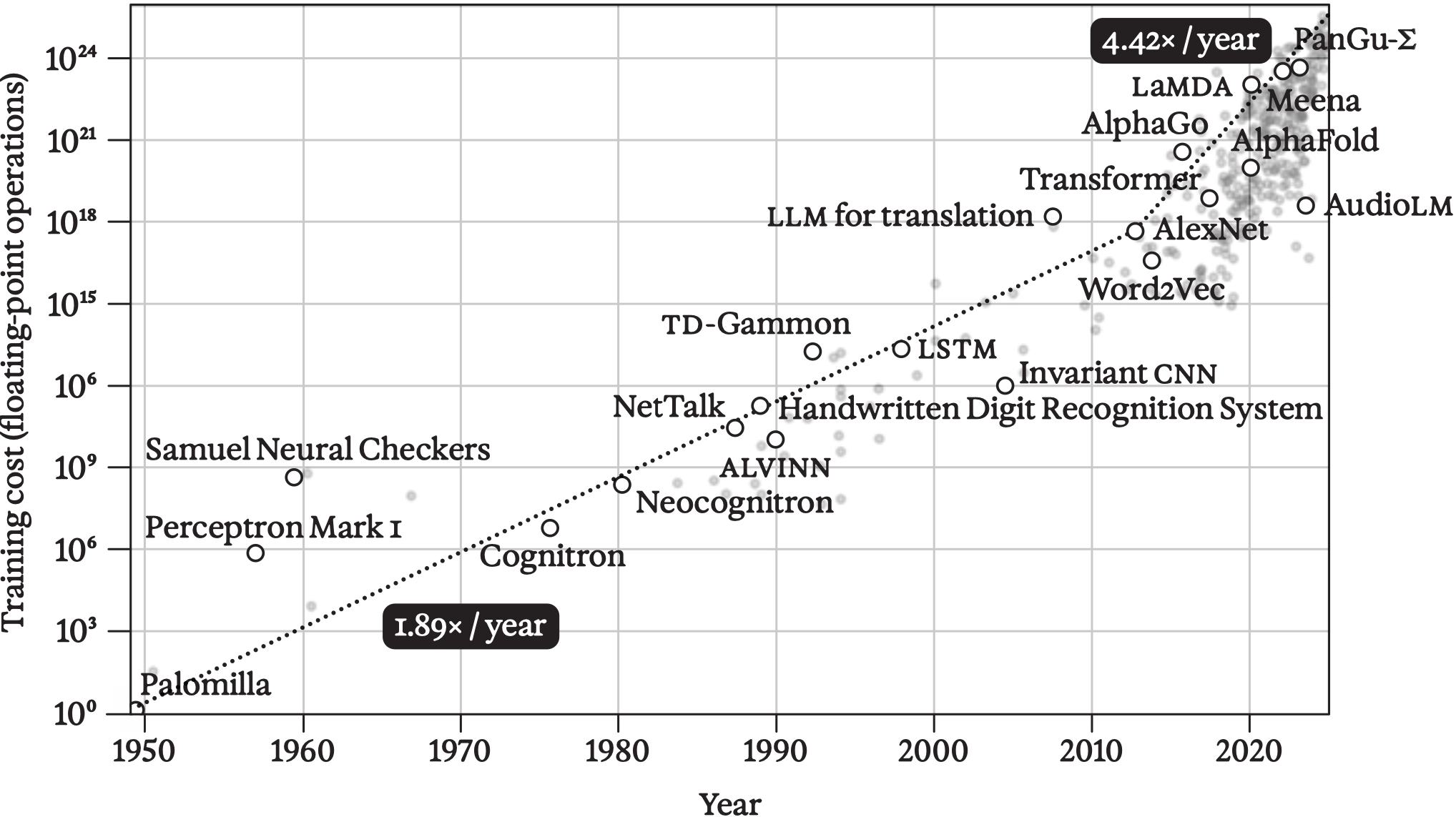 Exponential growth in computational cost of training, doubling approximately every year from 1949 until AlexNet in 2012, and every six months since then