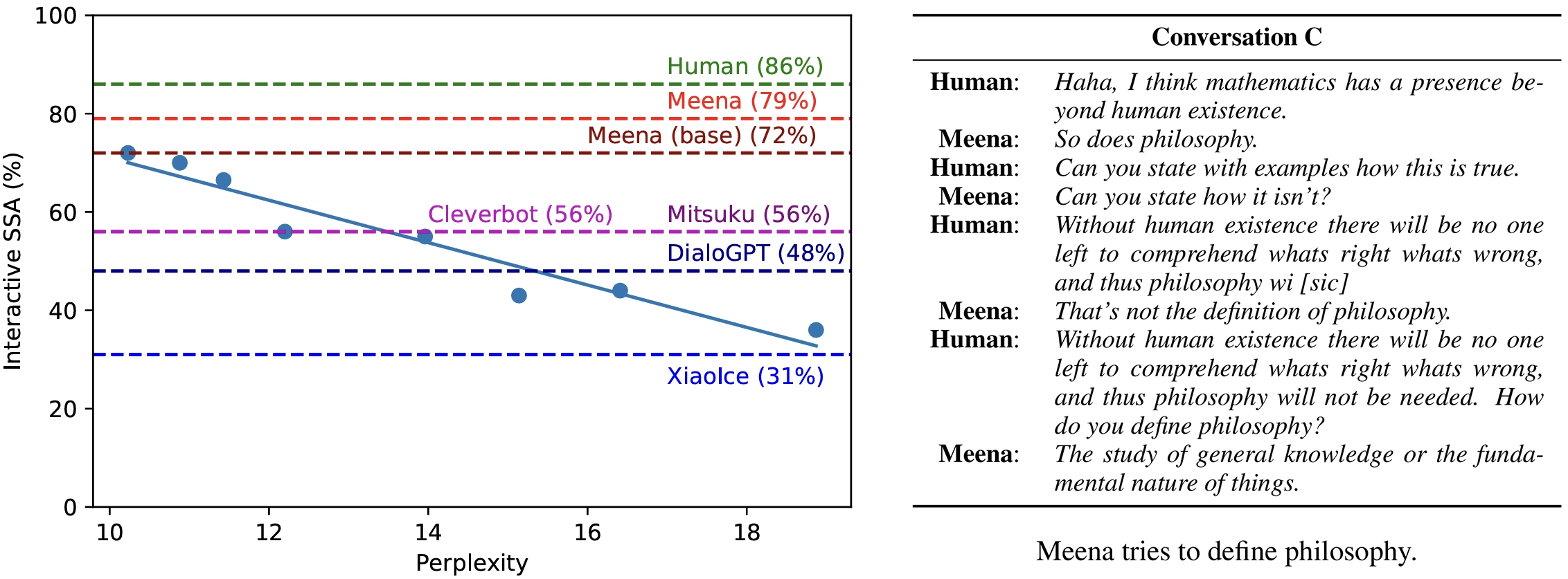 Figures from the Meena paper, showing early evidence of near-human-level performance on open-ended conversation; Adiwardana et al. 2020.