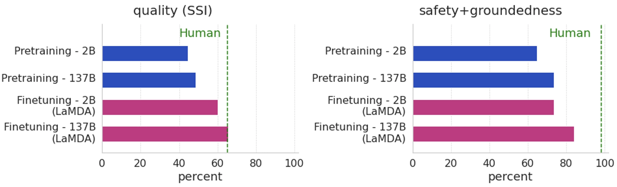 Figure from the LaMDA paper, showing the effect of fine-tuning for dialog quality, safety, and groundedness; Thoppilan et al. 2022.