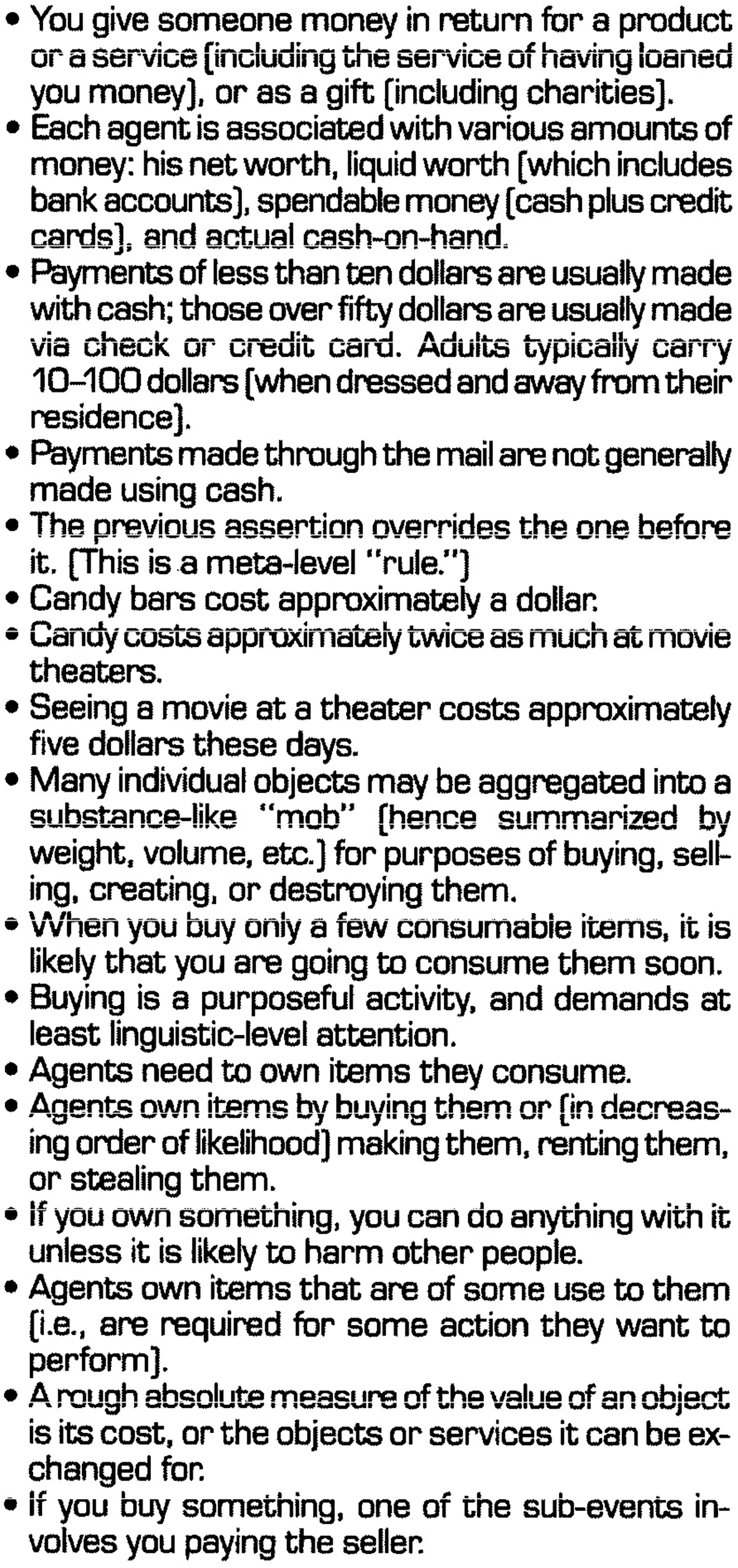 Some of Cyc’s manually coded “assertions” about the world (in 1990, the authors envisioned accumulating about one hundred million of these) relevant to processing the sentence, “On July 14, 1990, Fred Johnson went to the movies and bought candy.” The assertions can be used to “answer queries about whether he paid for it or not, whether he paid by cash or check or credit card, how much he paid for it, who owned it when, what Fred did with it, at least how much cash he had on him when he went to the movies, whether he knew he was buying the candy just before/during/after he bought it, whether he was sleeping while buying it,” and so on; Lenat et al. 1990.