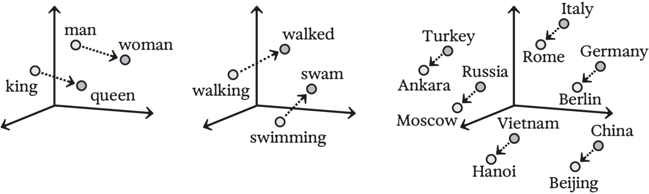 Relationships between word pairs in the Word2Vec embedding space: Left: male-female; Middle: verb tense; Right: country-capital. Redrawn from Shrivastava 2022.