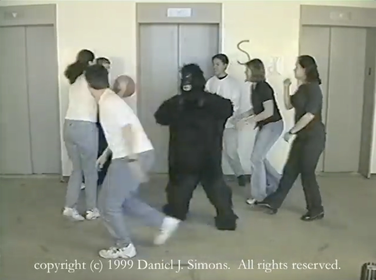 Upon initial viewing, most people are oblivious to the figure in the gorilla suit at the center of this freeze-frame from the famous “Gorillas in Our Midst” video (viewable here ), Simons and Chabris 1999.