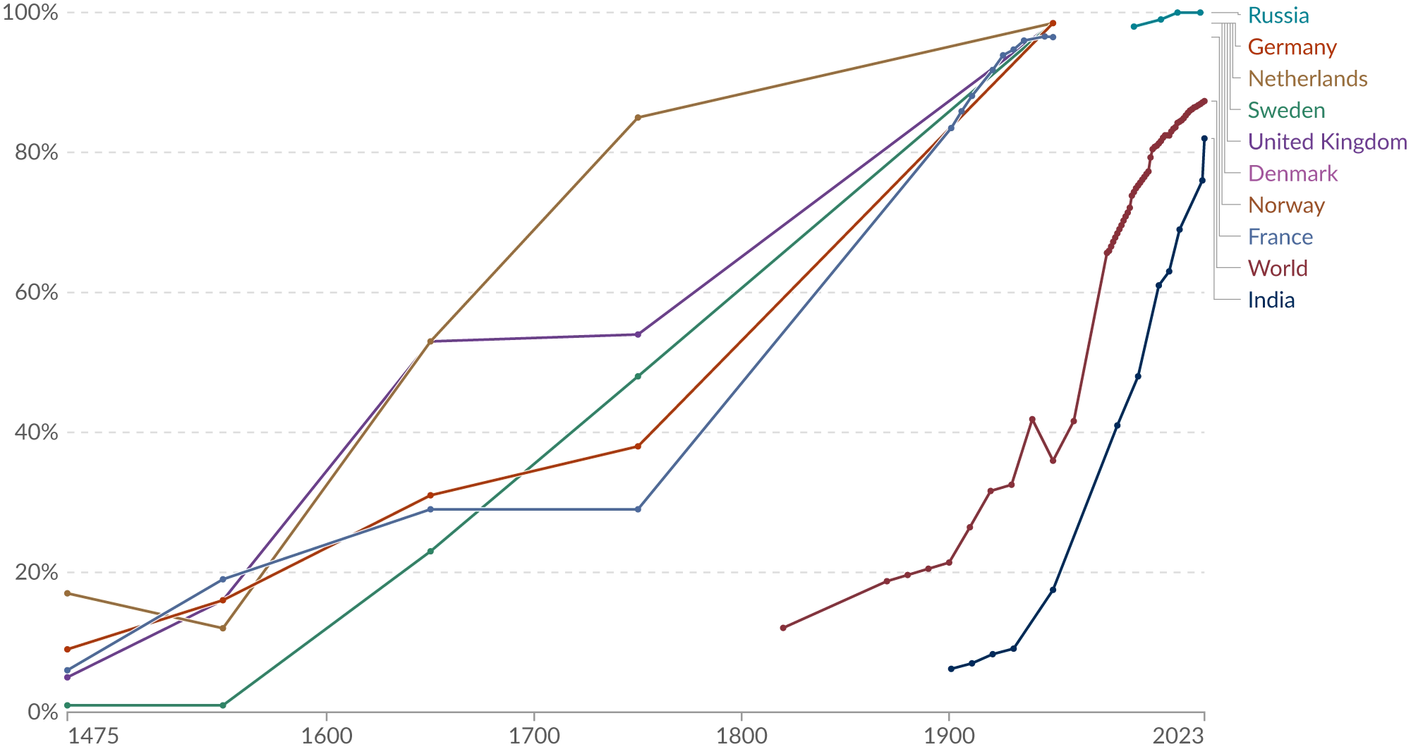 Worldwide literacy data, dating back to 1475 in a few countries with unusually high historical literacy rates; Roser and Ortiz-Ospina 2018.