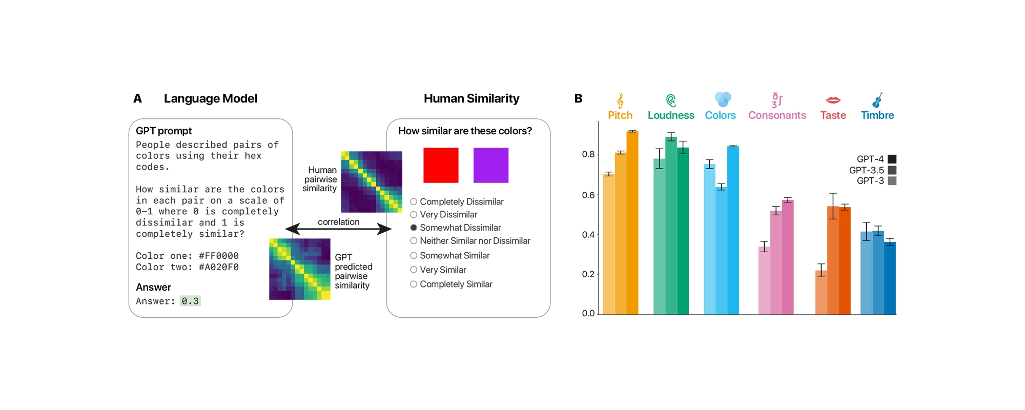 A 2023 paper entitled “Large Language Models Predict Human Sensory Judgments Across Six Modalities” nicely illustrates this.26 The paper’s authors ask a large language model to estimate the similarity between pairs of sensory stimuli based on textual descriptions. These modalities include pitch, loudness, colors, the sounds of consonants, tastes, and musical timbres, described either in quantitative terms (decibels or Hertz for sounds, numerical red, green, and blue component values for color) or by name (“quinine,” “artificial sweetener,” etc. for taste; “cello,” “flute,” etc. for timbre).