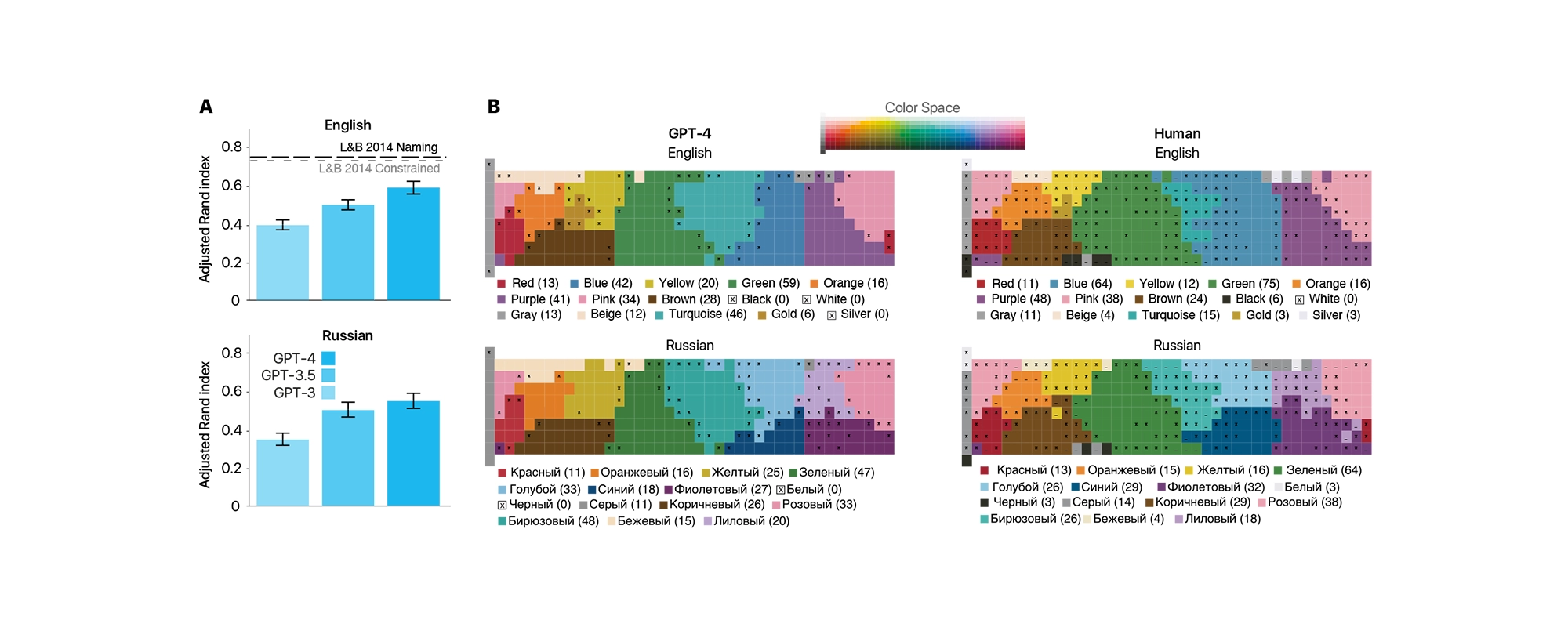 Language models can name colors. When doing so, they reflect the way different languages vary in their color naming, as shown here for English and Russian (which differ especially with regard to blue); Marjieh et al. 2023.