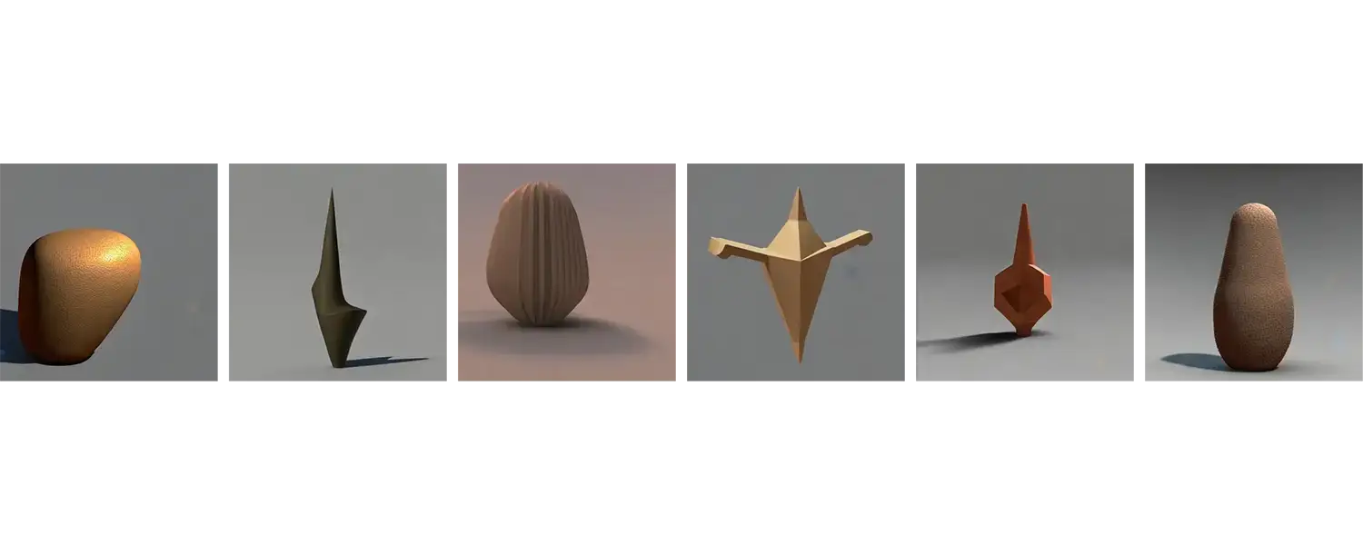 Random generations from the Stable Diffusion model using the prompt “A 3D rendering of a _____ shaped object,” where the blank was filled in as: (scroll to reveal)