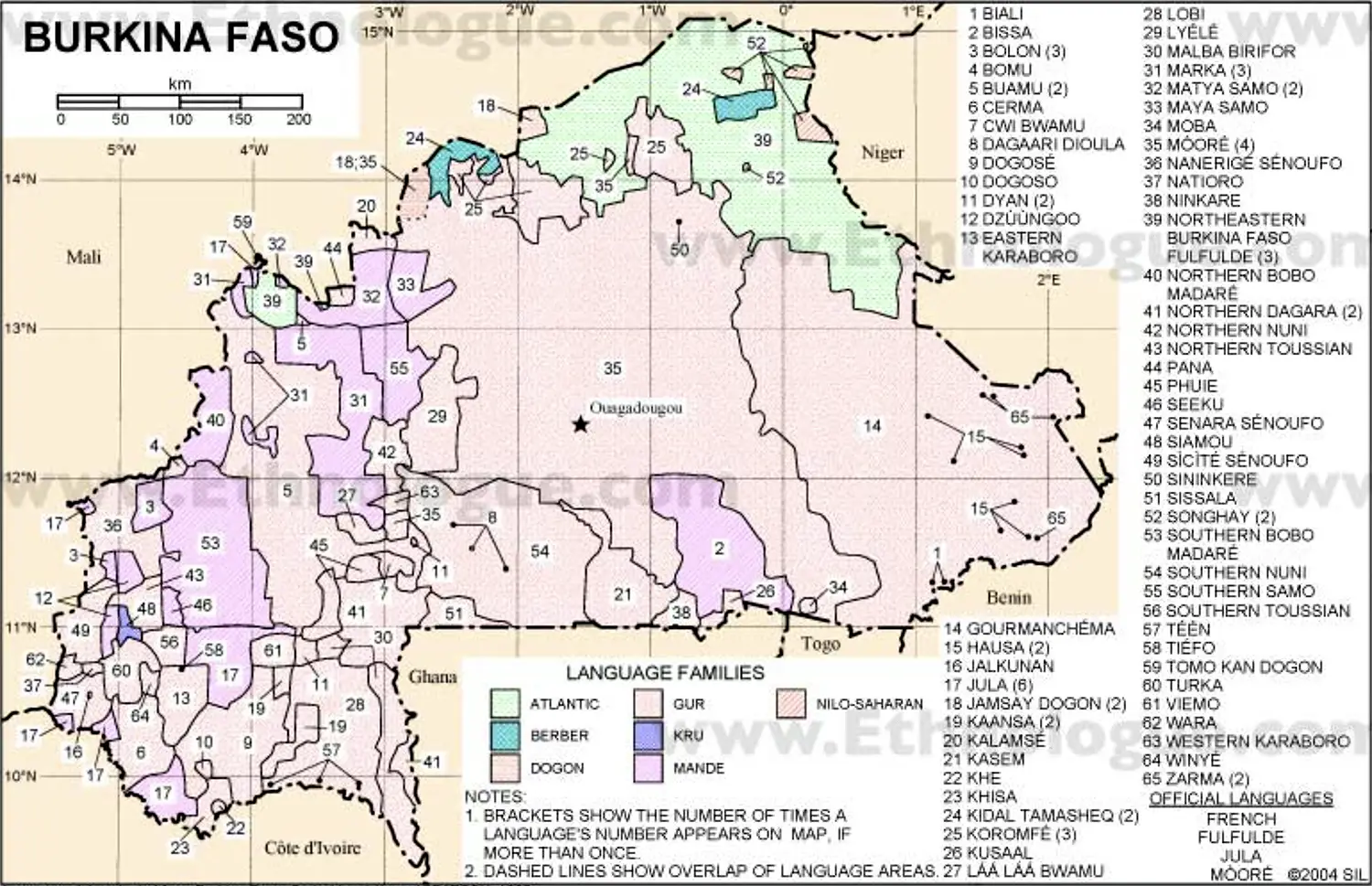 A map (doubtless incomplete) of the languages spoken in Burkina Faso, a country roughly the size of Colorado